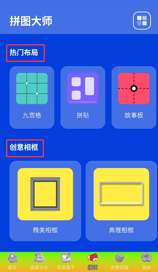 4、拼图创作区提供热门拼图模板和创意相框,可自由选择进行图片拼贴创作。