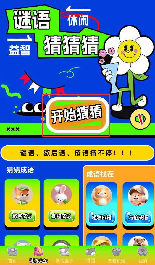 3、谜语专区包含"谜语竞猜"和"成语游戏"两大板块,支持即时开始趣味猜谜。