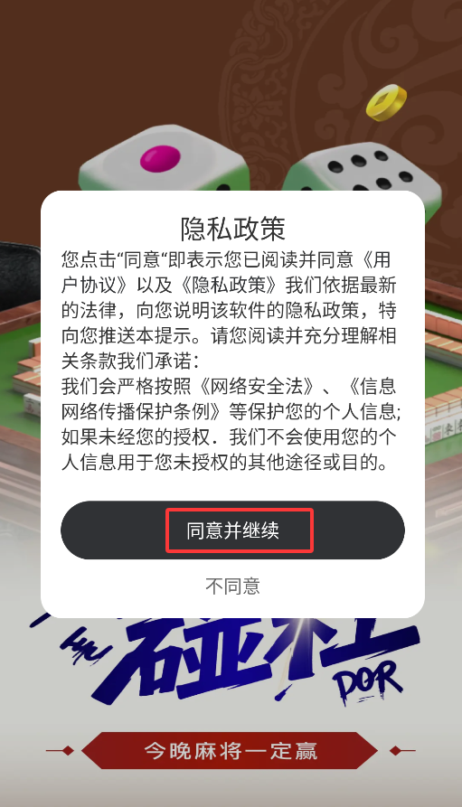 1、首次启动麻将棋牌计分器APP时,系统会弹出用户协议确认窗口,点击"同意"按钮后方可进入应用主界面。