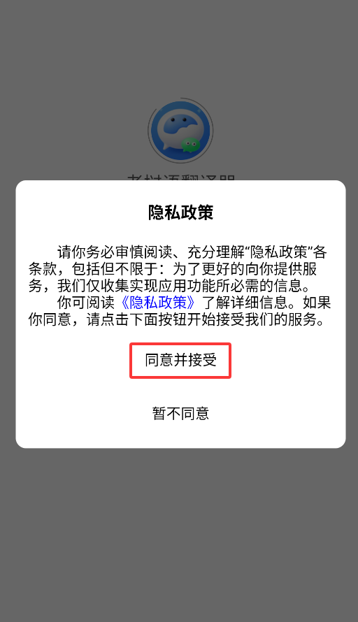 1、首次启动应用会显示隐私政策页面,必须点击"同意"按钮才能进入翻译主界面。