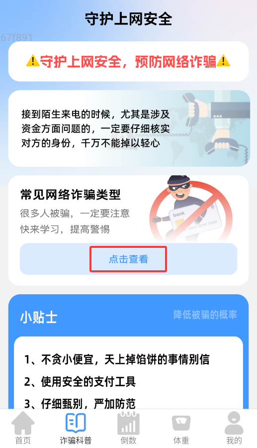 2、进入"安全防护"板块,可学习识别钓鱼网站、虚假热点等常见网络诈骗手法,提升防骗意识。