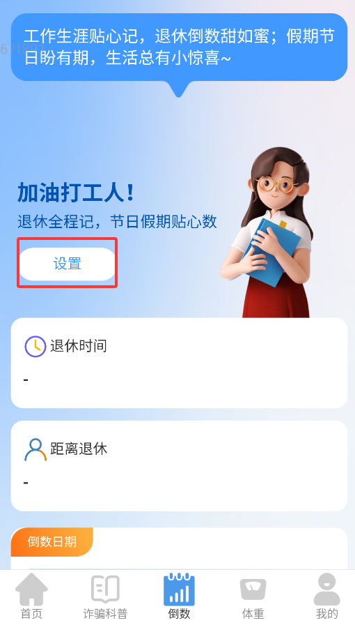 3、通过"生活助手"功能可设置退休倒计时,随时查看距离退休的剩余天数。