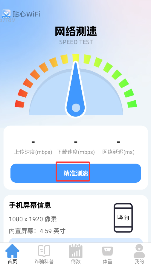 贴心WiFi APP测网速挺准的,一点就知道现在网速咋样。最实用的是能查网络安全,防诈骗提醒很及时。还有个额外功能是记体重变化,虽然跟WiFi没啥关系但用着还行。经常用公共网络的朋友可以试试,网速安全都能查,挺方便的。