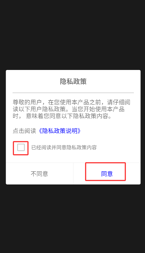 1、首次启动微服器APP时,系统会弹出用户协议窗口,勾选同意选项后点击"确认"按钮即可进入主界面。