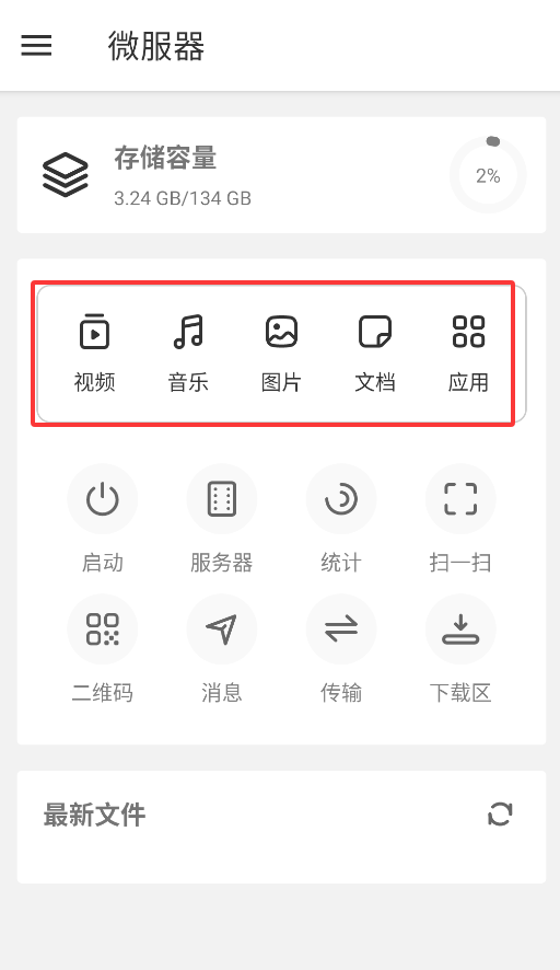 2、主界面提供多媒体文件管理功能,可分类查看视频、音频、图片及文档等各类文件。