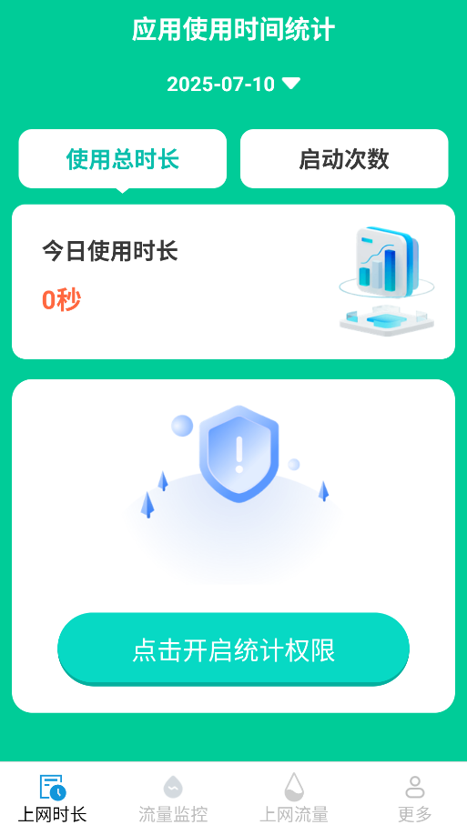1、启动应用后,在"上网时长"页面可查看各应用的使用时长统计,包括今日使用时长、启动次数及历史总时长等详细数据。