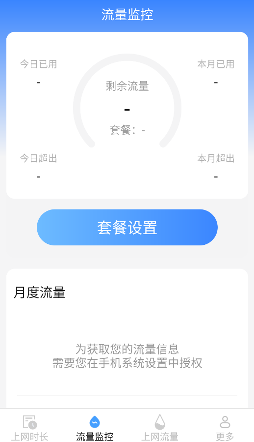 2、进入"流量监控"功能,实时显示剩余流量、今日/本月已用流量,支持自定义流量套餐和超额提醒设置。