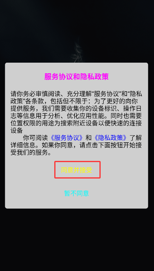 1、首次启动APP会弹出用户协议,点击"同意"后即可进入香氛机控制平台主界面。
