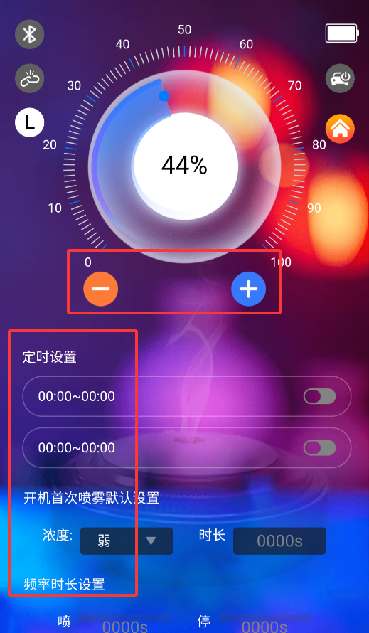 4、成功连接后,可调节喷雾量(低/中/高)、香氛浓度、定时开关及单次喷雾时长等参数。