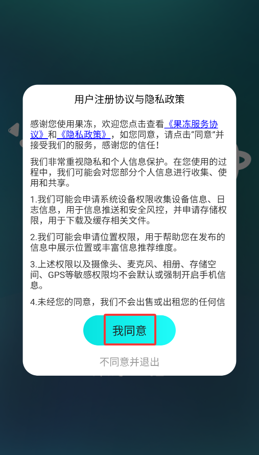 1、首次启动APP会弹出用户协议,需要点击"同意"按钮才能进入直播首页。
