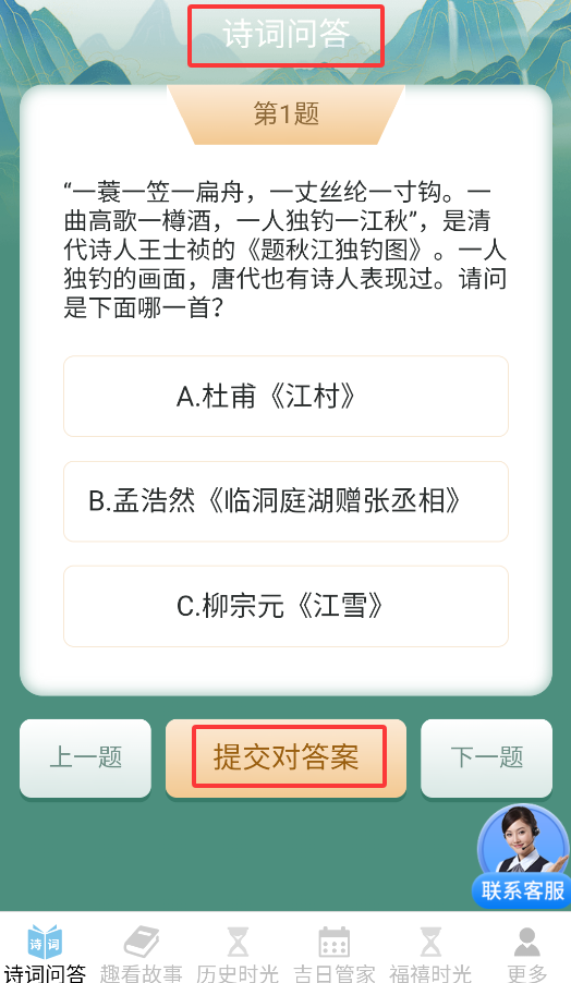 2、"诗词问答"板块随机出题,选择正确答案并提交后可查看解析及得分(连续答对积分翻倍)。