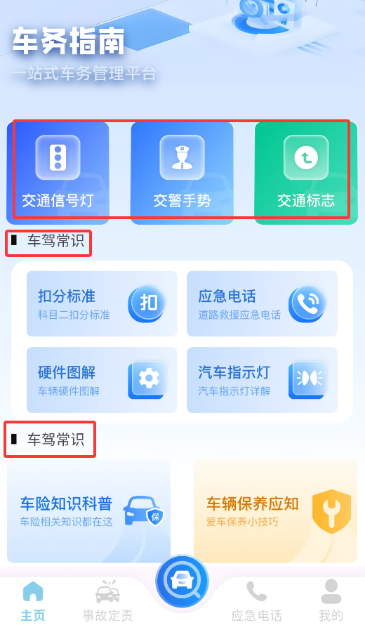 2、主页提供四大交规学习模块:交通信号灯图解、交警手势解析、交通标志大全及驾驶证使用常识。