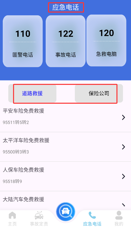 4、应急服务专区汇总全国道路救援电话、主要保险公司客服及交警报警电话,支持一键拨打。