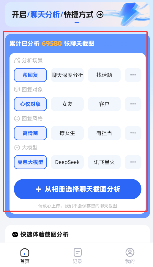 1、截图上传分析简单:快速截取聊天界面并一键上传,系统自动精准识别全部对话文字内容。