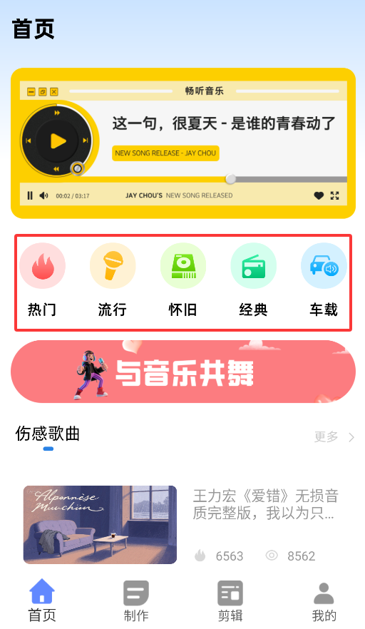 2、主界面划分五大推荐板块,包含时下热歌、潮流榜单、复古旋律及车享专曲等分类。