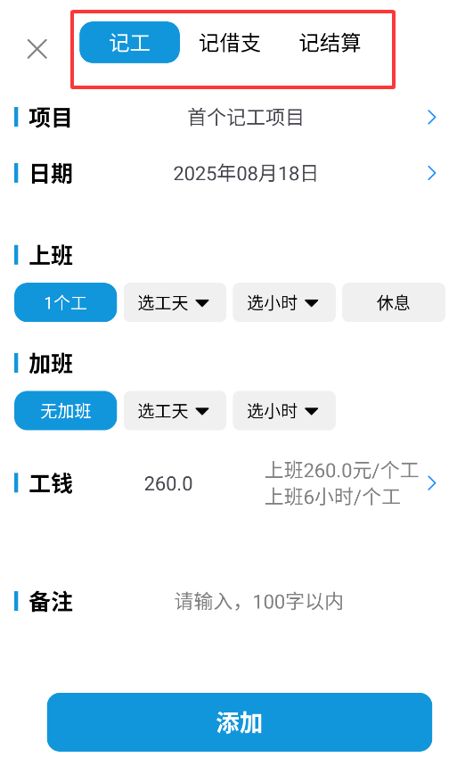 3、根据需要选择"记工"(工时记录)、"记借支"(借款登记)或"记结算"(项目结算)等具体记账类型。
