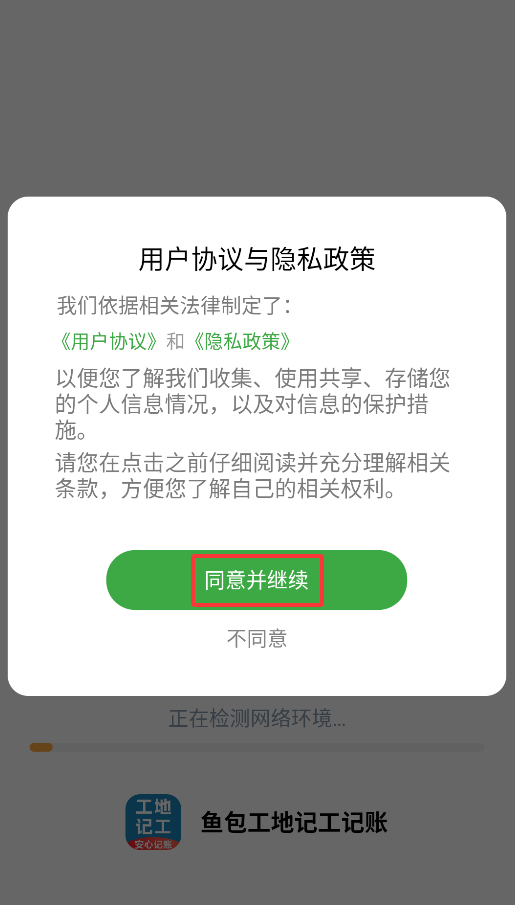1、首次启动APP会弹出用户协议,点击"同意"后即可进入工地记账系统主界面。