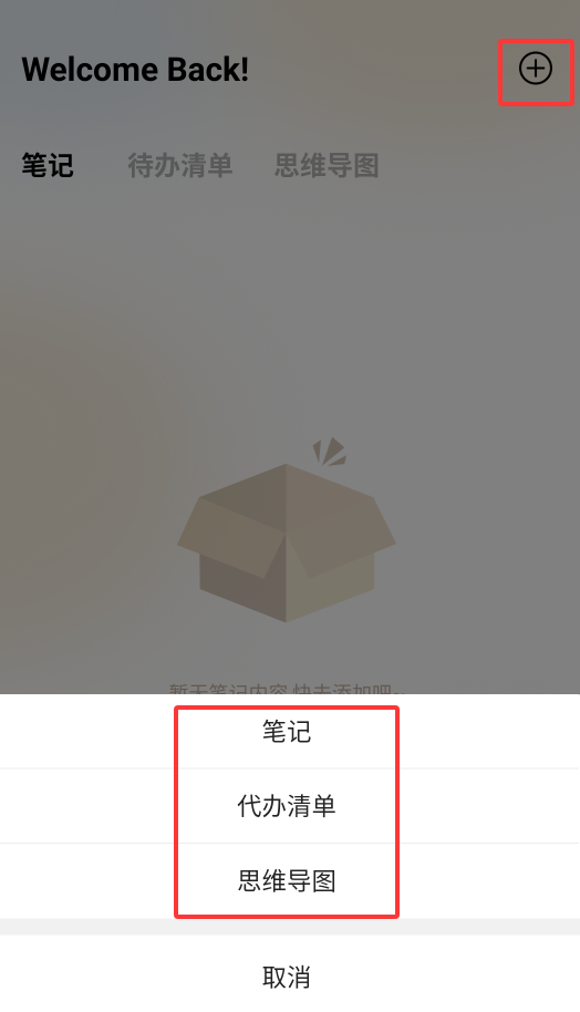 2、首页右上角"+"号支持新建笔记、待办清单、思维导图等多种内容类型。