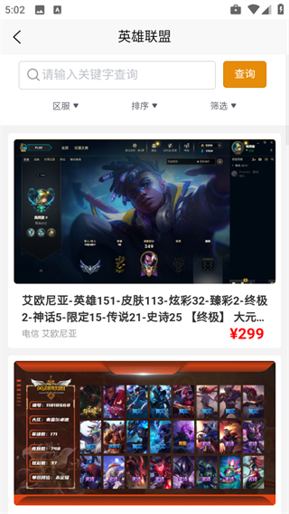 3、任意选择一款热门游戏的账号,这里小编以“英雄联盟”游戏为例。