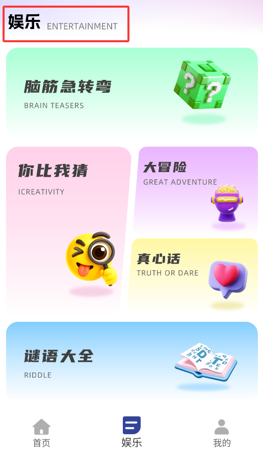 2、提供多种主题娱乐游戏功能模块,包括脑筋急转弯、你比我猜、谜语大全等,可单人挑战或邀请好友共同参与互动。
