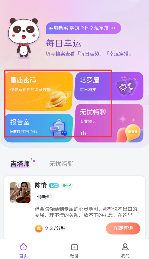3、咨询板块包含"无忧畅聊"(普通顾问)和"吉塔师"(专家预约)两类服务通道。