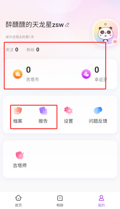 4、个人中心集中管理社交关系(关注/粉丝)、虚拟资产(吉塔币/幸运豆)及历史命理报告。