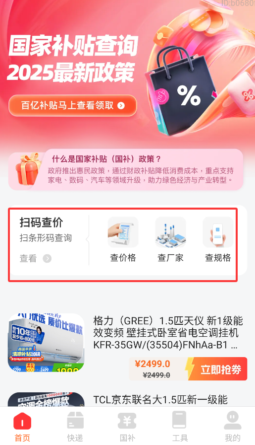 2、"扫码查价"功能支持扫描商品条形码,实时显示政府补贴后价格及厂商信息。
