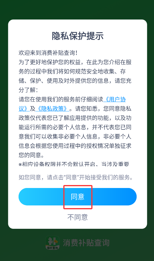 1、首次启动APP会显示隐私保护提示,点击"同意"按钮后进入消费补贴查询平台主界面。