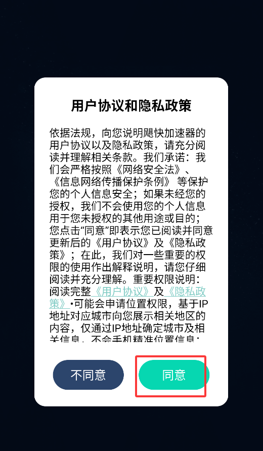 1、首次启动飓快加速器会显示用户协议页面,点击"同意"按钮后即可进入游戏加速主界面。