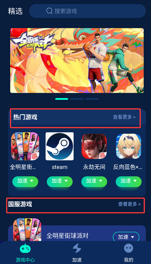 2、"游戏大厅"板块展示热门网游和国服专区,包含各类主流游戏的加速通道。