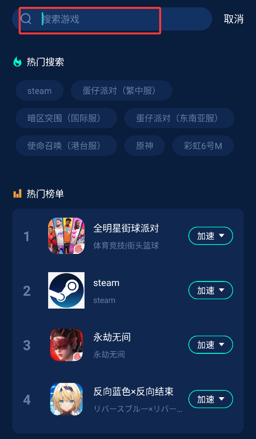 3、搜索栏支持输入游戏名称关键字,快速定位需要加速的特定游戏项目。
