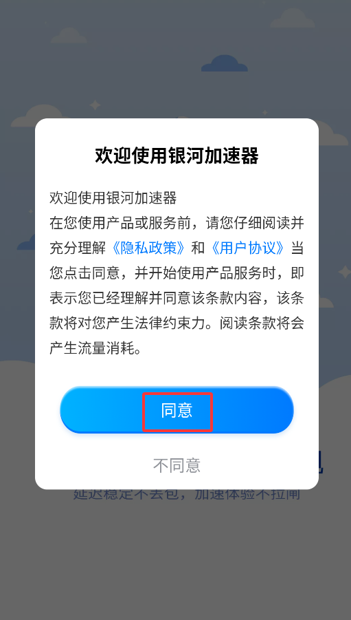 1、首次打开APP会弹出用户协议,勾选同意后才能进入加速器主界面。
