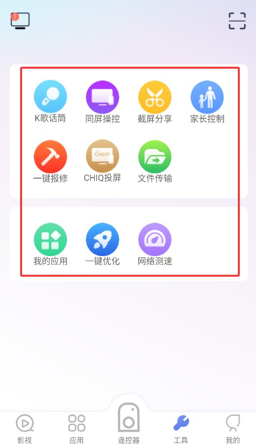 4、工具箱集成多项实用功能K歌话筒、同屏、截屏分享、家长控制等