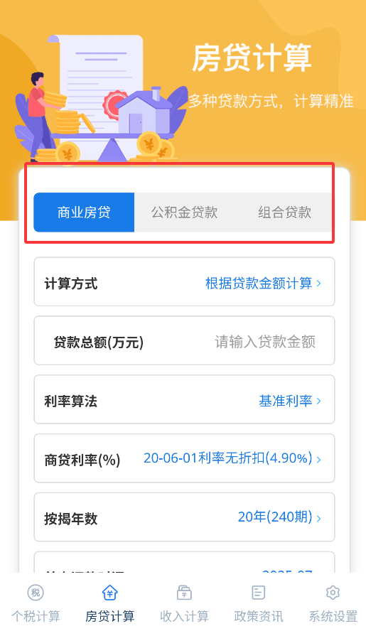 3、"房贷计算"功能涵盖商业贷款、公积金贷款及组合贷款等多种还款方式计算。
