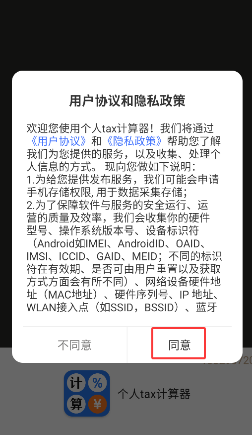 1、首次启动APP会显示用户协议和隐私政策,点击"同意"按钮后即可进入税务计算主界面。