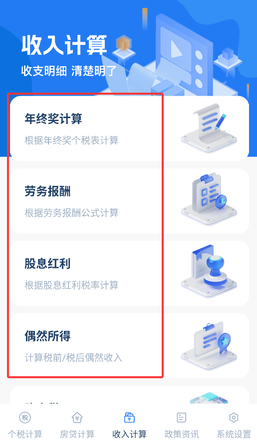 4、"综合所得"计算器可处理年终奖、劳务报酬等各类收入类型的税务核算。
