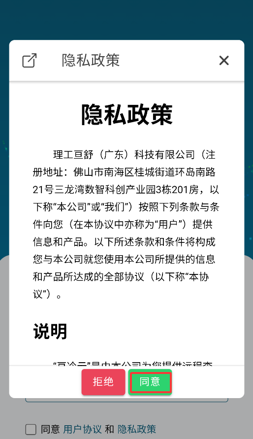 1、首次启动APP会弹出用户协议,点击"同意"后进入登录页面。