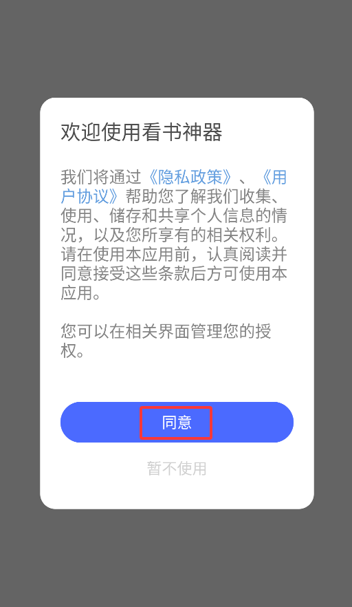 1、首次启动APP会弹出用户协议,点击"同意"后即可进入电子书阅读平台主界面。