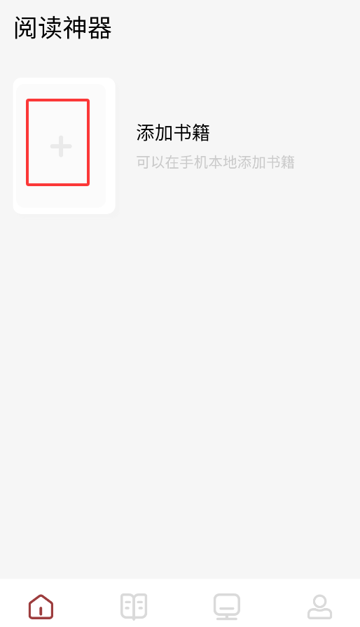 2、首页"阅读神器"支持从手机本地导入TXT/EPUB/PDF格式图书(点击"+"号选择文件)。