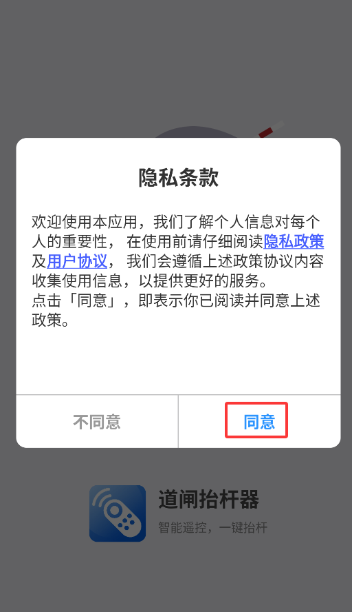 1、首次启动APP时会弹出隐私条款,点击"同意"按钮后方可进入道闸控制主界面。