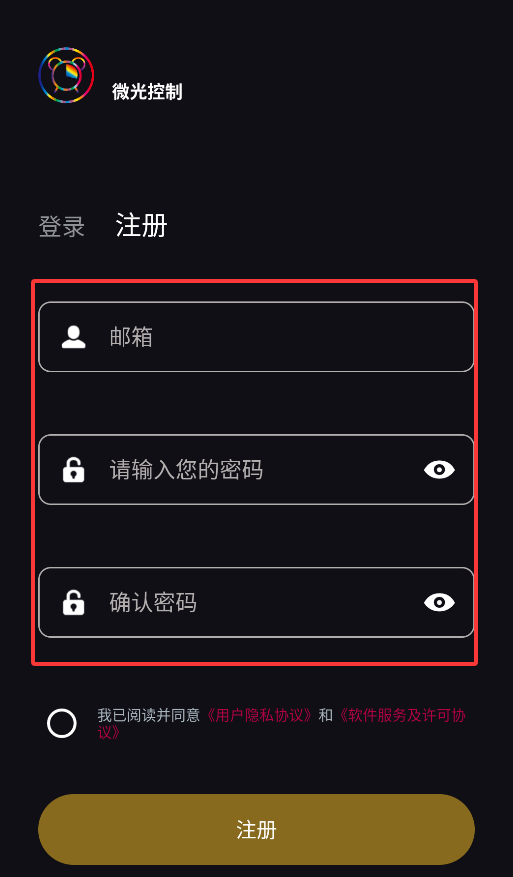 3、填写有效的电子邮箱地址,设置并确认登录密码后,点击"完成注册"即可创建账户。
