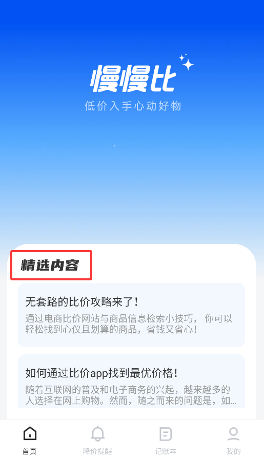 2、首页"精选推荐"板块推送全网热门商品的历史价格曲线和优惠预警提示。