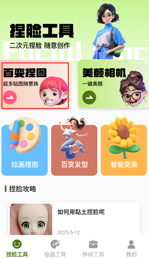2、主功能区的"百变捏图"工具提供海量面部特征模板,可自由调整五官比例和细节。