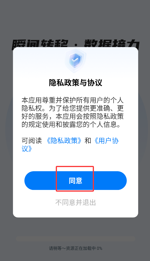 1、首次启动APP会显示隐私政策与用户协议,点击"同意"按钮即可进入主界面。
