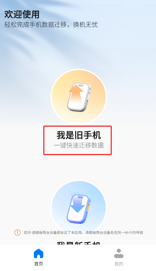 2、在首页需要选择设备类型,根据需求点击"我是旧手机"或"我是新手机"选项。