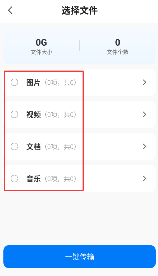 3、进入文件选择界面,可勾选需要传输的照片、视频、音乐等各类文件和数据。