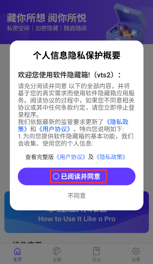 1、首次启动软件隐藏箱APP时,系统会弹出用户协议窗口,点击"同意"按钮后即可进入主界面。
