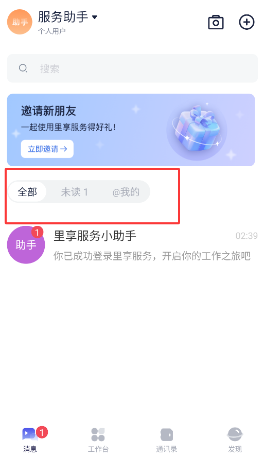 3、"消息中心"分类显示未读通知、@提醒等,支持关键词搜索聊天记录。