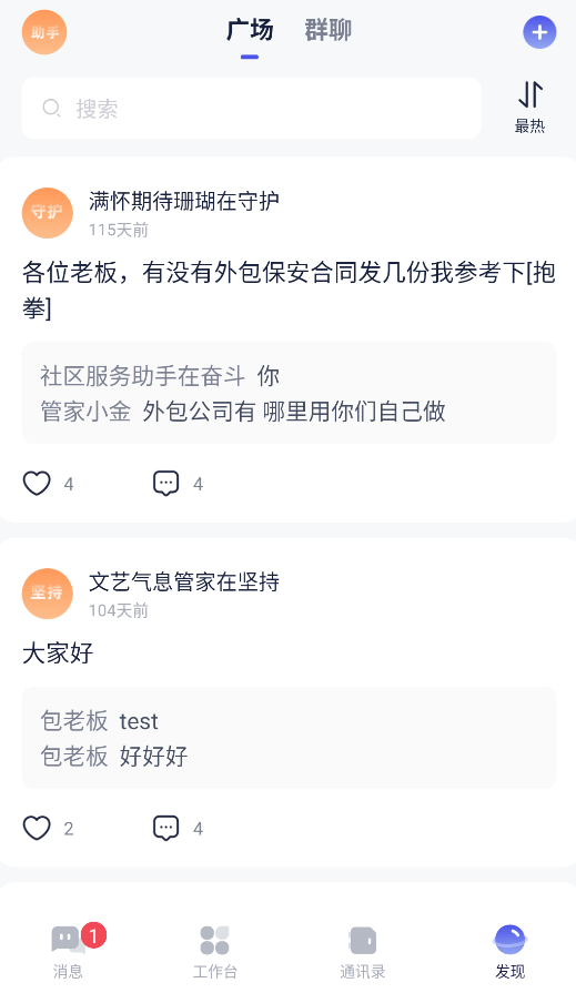 4、"社区互动"包含业主广场和楼栋群聊,可参与话题讨论或发起投票。