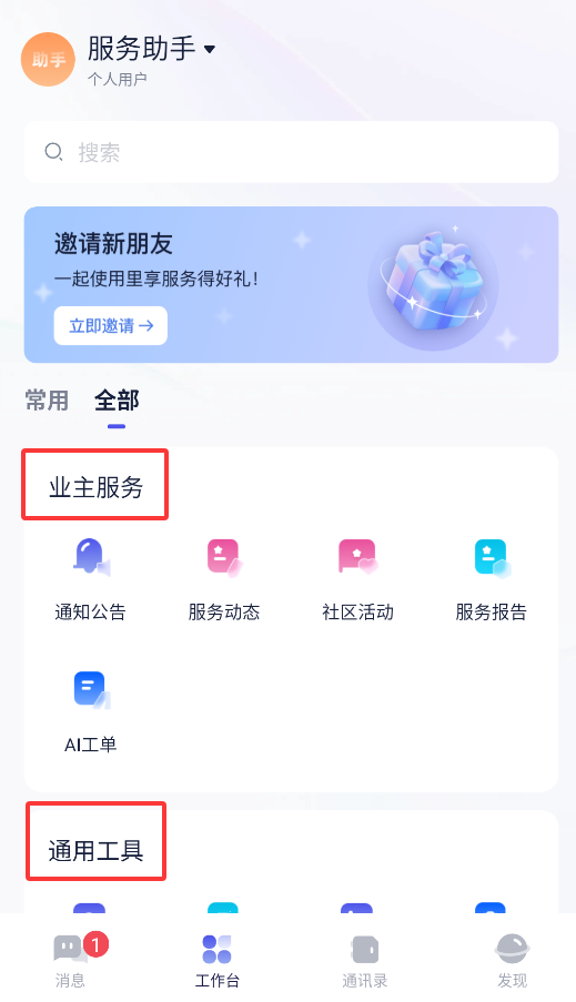 2、"服务大厅"集成物业报修、费用缴纳等业主专属功能,提供20+便民工具。